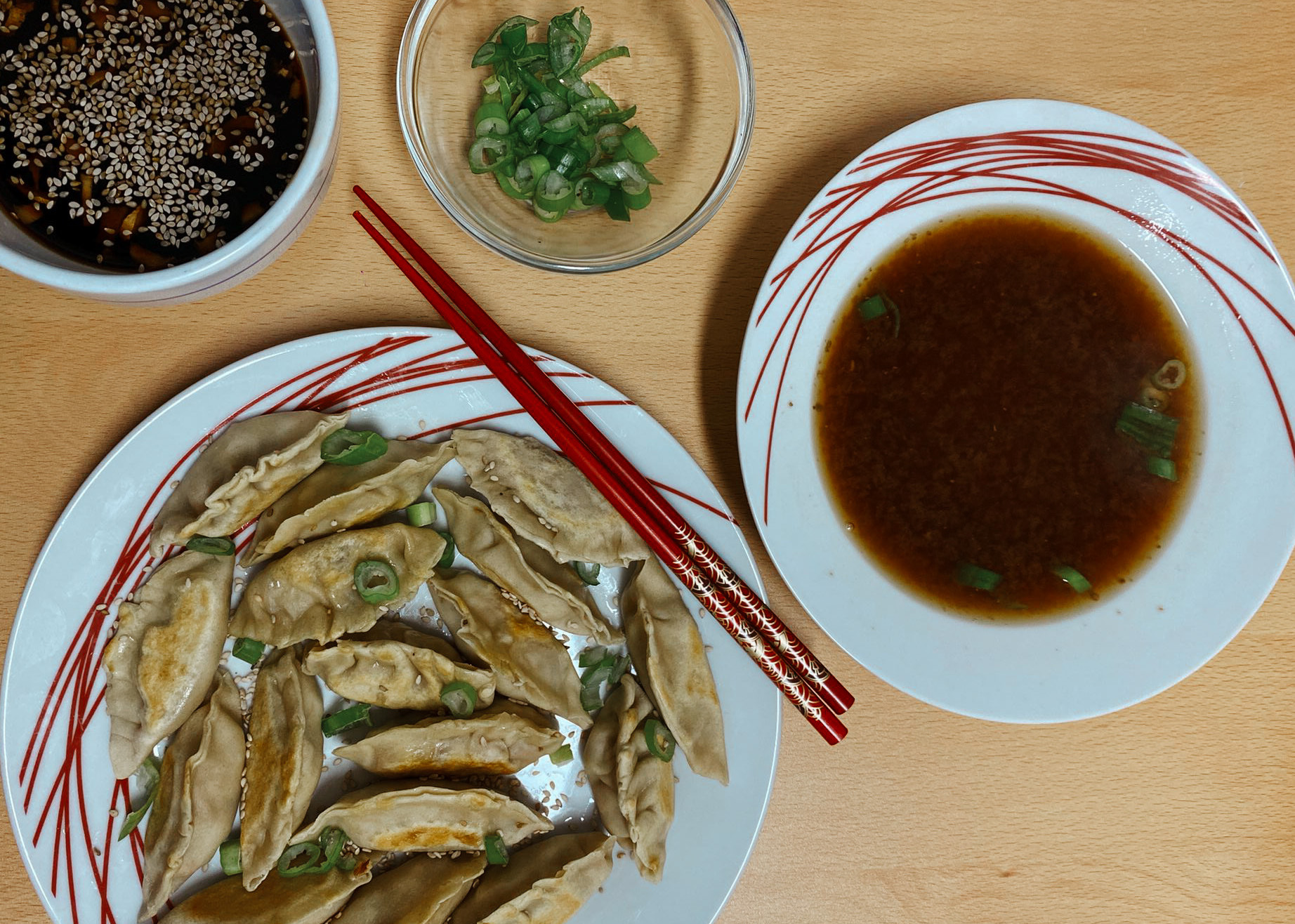 And it is done ! Now you have your gyozas and you can eat them with a soja sauce and some sesame seeds and green oignons as a toppings.